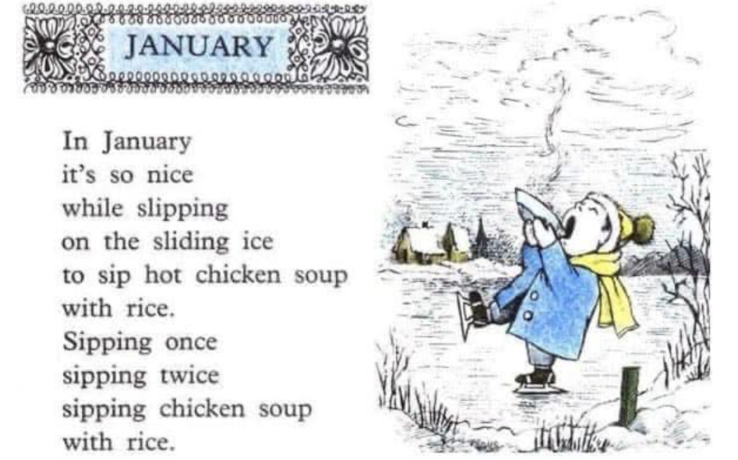 I re-read Maurice Sendak’s children’s book, Chicken Soup with Rice a few days in to the New Year. The book revolves around descriptions of the months, and January’s is oh-so fitting:
